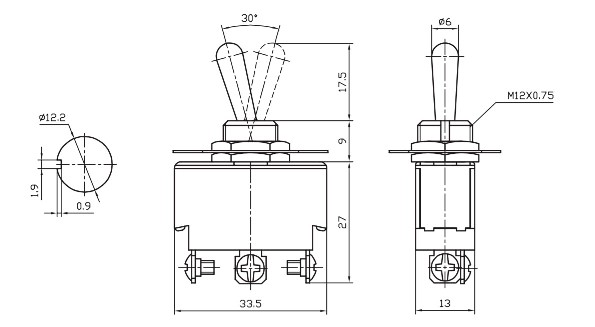 Тумблеры типа KN3 среднего типоразмера (Medium) предназначены для коммутации цепей питания и управления постоянного и переменного токов. Номинальные значения для цепей переменного тока составляют по напряжению – 250 (125) В; по току – 3 (5) А, соответственно. Схема переключения может быть реализована на 2 положения ON-OFF; ON-ON или на 3 положения ON-OFF-ON, при этом одно или 2 крайних положения могут быть с фиксацией – ON или без фиксации – (ON). Наиболее распространенное число контактных групп из 2-х или 3-х контактов – 1 или 2. Диаметр посадочного отверстия для тумблеров типа KN3 – Ф12,2 мм. Тумблеры снабжены пластиной указания режима работы.