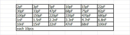 2pF, 3 pF, 5 pF, 10 pF, 15pF, 22pF, 30 PF, 33pF, 47pF, 68pF, 75pF , 82pF 100 pF, 150pF, 220pF, 330pF, 470pF, 680pF 1nF, 1.5nF, 2.2nF, 3.3nF, 4.7nF, 6.8nF, 10nF, 15nF, 22nF, 47nF, 68nF, 100nF Каждый 10 шт.