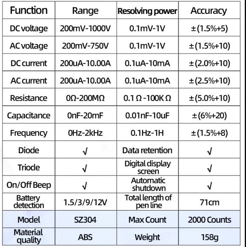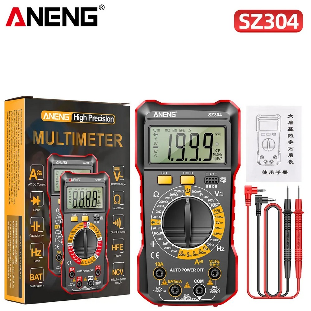 ANENG SZ304 Многофункциональный цифровой мультиметр с функцией истинного среднеквадратичного значения, портативный высокоточный тестер NCV, измеритель напряжения переменного/постоянного тока, сопротивления, инструмент для измерения в омах ANENG SZ304 — это портативный цифровой мультиметр, разработанный и произведённый в соответствии с международными стандартами электробезопасности. Он используется для измерения напряжения переменного/постоянного тока, силы тока переменного/постоянного тока, сопротивления, ёмкости, диодов и других параметров. Особенность: Модель: SZ304 Функция Диапазон Разрешающая способность Точность Напряжение постоянного тока 200mV-1000V 0.1 мВ-1В ± (1.5% + 5d) Напряжение переменного тока 200mV-750V 0.1 мВ-1В ± (1.5% + 10d) Постоянный ток 200uA-10A 0.1uA-10mA ± (2.0% + 10d) Переменный ток 200uA-10A 0.1uA-10mA ± (2.5% + 10d) Сопротивление 0Ω-200MΩ 0.1Ω-100kΩ ± (5.0% + 10d) Емкость 0nF-20mF 0.01нФ-10 мкФ ± (6.0% + 20d) Частота 0 Гц-2 кГц 0,1 Гц-1 Гц ± (1.5% + 8d) Диод √ Сохранение данных √ Триод √ Экран цифрового дисплея √ Звуковой сигнал включения/Выключения √ Автоматическое выключение √ Обнаружение батареи 1.5/3/9/12V Максимальная длина тестового провода 71 см Качество материала ABS Максимальное количество 2000 Отсчетов Вес 158g Содержимое упаковки: 1 мультиметр SZ304 ( без батареи ) 2 щупа 1 руководство пользователя 1 Упаковочная коробка