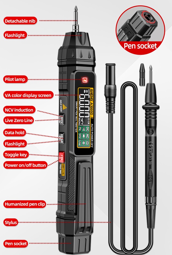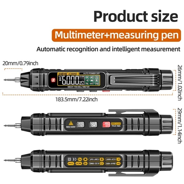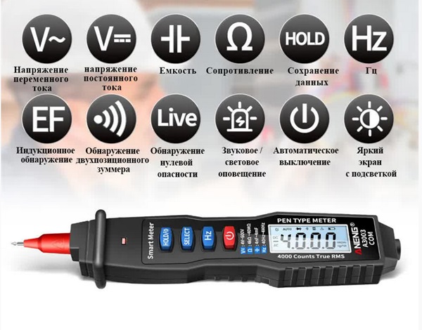 A3005D тестер мультиметр, NCV, фаза, 6000 — описание:Измерительные приборы ANENG A3005D цифровой мультиметр-тестер в виде щупа/ручки, с бесконтактным измерителем переменного и постоянного напряжения (NCV), измерением сопротивления, емкости, частоты. Детектор фазы/нуля. ЖК-дисплей с подсветкой, True RMS 6000 отсчетов, фонарик, автоматическое выключение, сохранение данных.