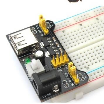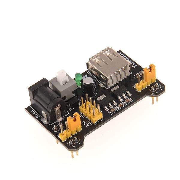 Power MB102black модуль питания макетной платы (KZY0026) — описание:Конструкторы, платы ARDUINO Конструкция модуля предусматривает его установку на безпаечную макетную плату. Модуль предназначен для получения стабилизированных напряжений 5В и 3,3В, которые необходимы практически в любом цифровом проекте. Основным вариантом подачи питания на сам модуль является подключение блока питания с напряжением 7-12V к разъему постоянного тока DC-5,5/2,1(плюс в центре). При таком включении модуль имеет три группы выходов со стандартными штырями 2,54мм, (на схеме секции SA, SB , SC) и USB-разъем также является выходом для питания других устройств по стандартному USB-кабелю из набора Arduino USB A/B Cable. При наличии кабеля «USB-A/USB-A» модуль позволяет подать питание по этому кабелю и получить на выходе те же напряжения. В этом случае стабилизатор на 5V не используется, поэтому стабильность, “чистота” напряжения 5V и максимальный ток определяются внешним USB- источником. Выходы модуля организованы в виде трех секций, две из которых, обозначенные на схеме SB и SC, служат для установки на беспаечную макетку. Штыри “+” и “-” этих секций направлены вниз, причем для лучшего контакта штыри продублированы. Для каждого из этих выходов независимо друг от друга с помощью джампера устанавливается необходимое напряжение 5V, 3.3V или “OFF”. Это позволяет создать на макетной плате одновременно две шины питания с разными или одинаковыми напряжениями и оперативно их изменять Еще одна секция штырей (на схеме SA) в центре платы “смотрит” вверх. На ней имеется по два выхода каждого напряжения. Отсюда питание снимается, например, для второй макетной платы с помощью соединительных проводов. Кнопка с фиксацией включает – отключает питание во всех каналах. Светодиод показывает наличие напряжения на линии 5В. Расстояние между выходными штырями рассчитано для установки модуля на шины питания с шагом 44,5мм. Такой шаг имеют беспаечные макетные платы шириной 55мм.