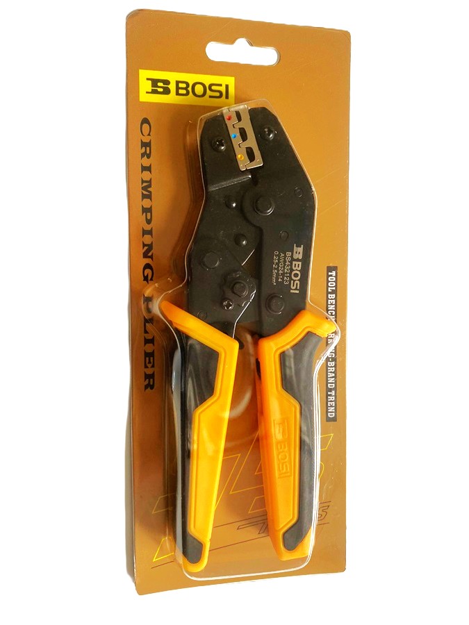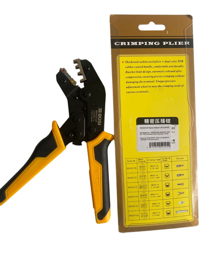 BS432123 - пресс клещи (кримпер) для обжима клемм диаметром 0.25-2.5мм2. Особенности: – изготовлены из специальной легированной стали в сочетании с передовой технологией MIM, которая обеспечивает высокоточный, долговечный и надежный обжим клемм; – прецизионная конструкция обжимного колеса (саморазъемное механическое устройство); – гарантированное качество обжима; уникальное устройство для регулирования давления, позволяющее подстроиться под обжим клемм разного диаметра; – двухцветные ручки с резиновым покрытием TPR, удобный захват. Характеристики: – Размер блистера 250*100*40мм, – Вес 400г. Пресс - клещи Bosi Tools - идеальный инструмент для профессионалов и энтузиастов, которые стремятся к эффективности и точности в своих задачах. Благодаря эргономичному дизайну и прорезиненной ручке они обеспечивают комфорт и безопасность во время использования. Изготовленные из высококачественной стали, клещи отличаются долговечностью и прочностью. Идеально подходят для электриков, техников и любителей.