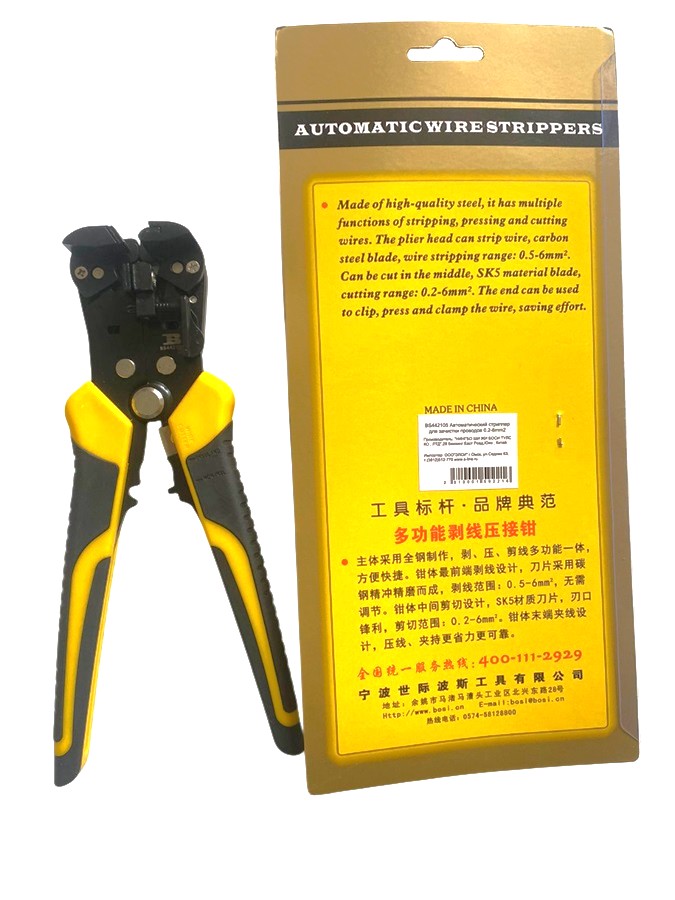 BS442105 - автоматические клещи (стриппер) для снятия изоляции, обжима и резки проводов. Изготовлены из высококачественной стали на высокоточном оборудовании, что гарантирует длительный срок службы. Оснащены автоматическим механизмом, который делает процесс снятия изоляции простым и эффективным. Не нужно прилагать больших усилий – достаточно установить кабель в клещи и легким нажатием на ручки удалить изоляцию. Это значительно экономит время и силы и обеспечивает высокую точность работы. Применяются для электромонтажных и ремонтных работ, технического обслуживания оборудования. Особенности: – Регулировка длины снятия изоляции; – Автоматическая настройка на нужный размер проводов; – Губки из высококачественной стали; – Резак из прочной инструментальной стали SK5; – Двухцветные ручки с резиновым покрытием TPR. Характеристики: – Снятие изоляции с проводов 0,5-6мм2. – Резка проводов 0,2-6мм2. – Обжим наконечников. – Размер блистера 250*100*40мм, – Вес 400г.