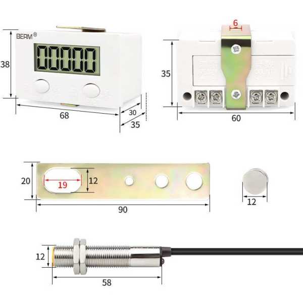 Технические параметры: Источник питания: 1,5 В — батарея типа АА (не входит в комплект) Диапазон подсчета: 0 — 99999 Максимальная частота: 20 Гц минимальная ширина импульса: 10 мс Максимальное сопротивление контакта: ≤ 10 кОм Минимальное сопротивление контакта: ≥ 500 кОм Кнопки сброса и паузы Температура окружающей среды: -5—40°C Размеры: 64*38*38 мм Как пользоваться: Начать отсчет: подсчитывая входной контактный сигнал терминала, счетчик начинает отсчет. Пауза подсчета: Нажмите кнопку PAUSE, чтобы приостановить подсчет; нажмите кнопку PAUSE еще раз, чтобы возобновить счет. Очистите индикацию: нажмите RESET