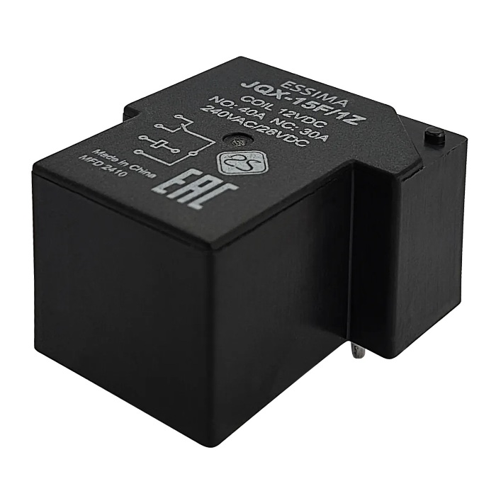 Реле JQX-15F с одним перекидным контактом для печатного монтажа. Допустимый ток через контакты до 40А по категории применения AC-1. Напряжение питания управляющей катушки - 12В постоянного тока. Реле применяются в схемах автоматики для коммутации электрических цепей постоянного и переменного тока. Технические параметры